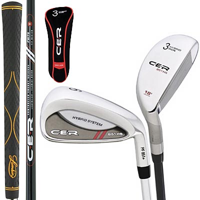 CER Hybrid System: #3 Hybrid, #4 Hybrid, #5 iron thru Pitching Wedge, 2 CER FW70 graphite shafts for the Hybrids and 6 FST 90 steel shafts for the irons, and Lamkin Crossline grips.